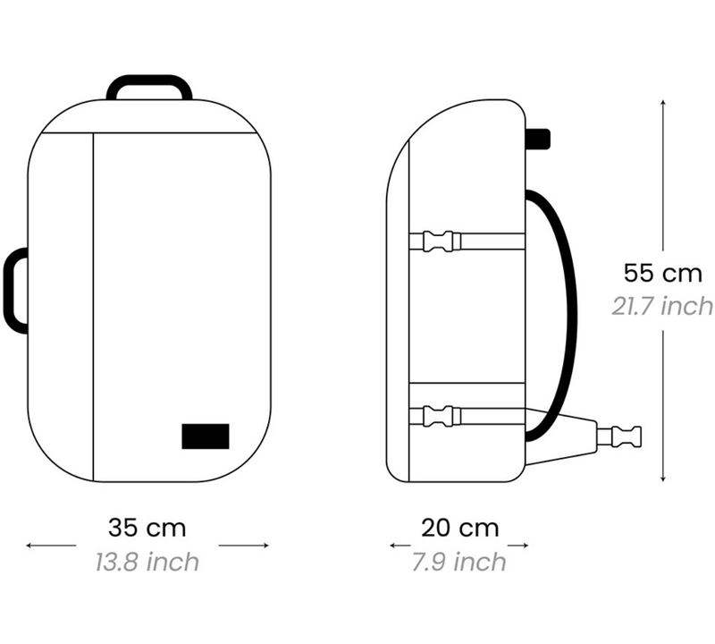 Our ADV Backpack 42L has dimensions 55 x 35 x 20 cm, which can be brought on board for 107 airlines. Check airlines list below