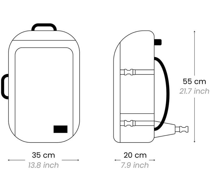 Our ADV Pro Backpack 42L has dimensions 55 x 35 x 20 cm, which can be brought on board for 107 airlines. Check airlines list below